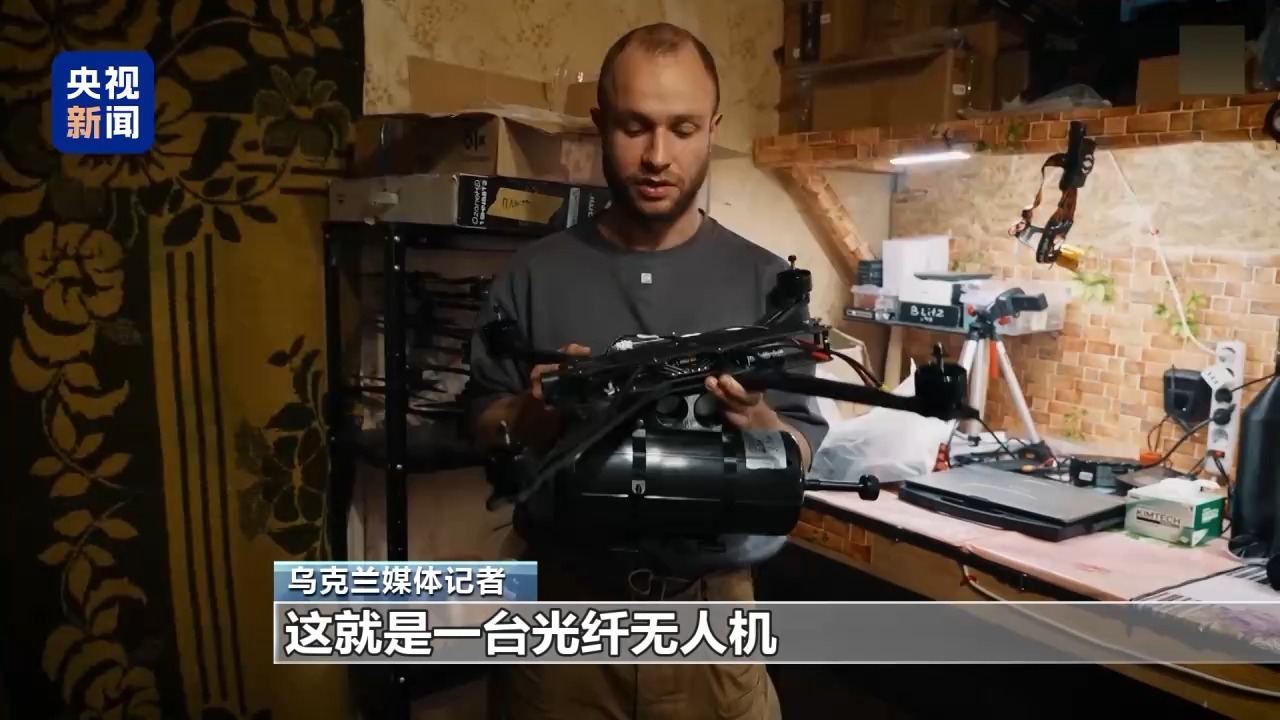 乌克兰媒体记者:这就是光纤无人机,上面是一架普通的碳纤维第一视角无人机,这架无人机相当大,原因就是它除了要搭载电池和弹药,还得携带这个东西,一卷10千米长,非常细且非常轻的光纤线缆。
