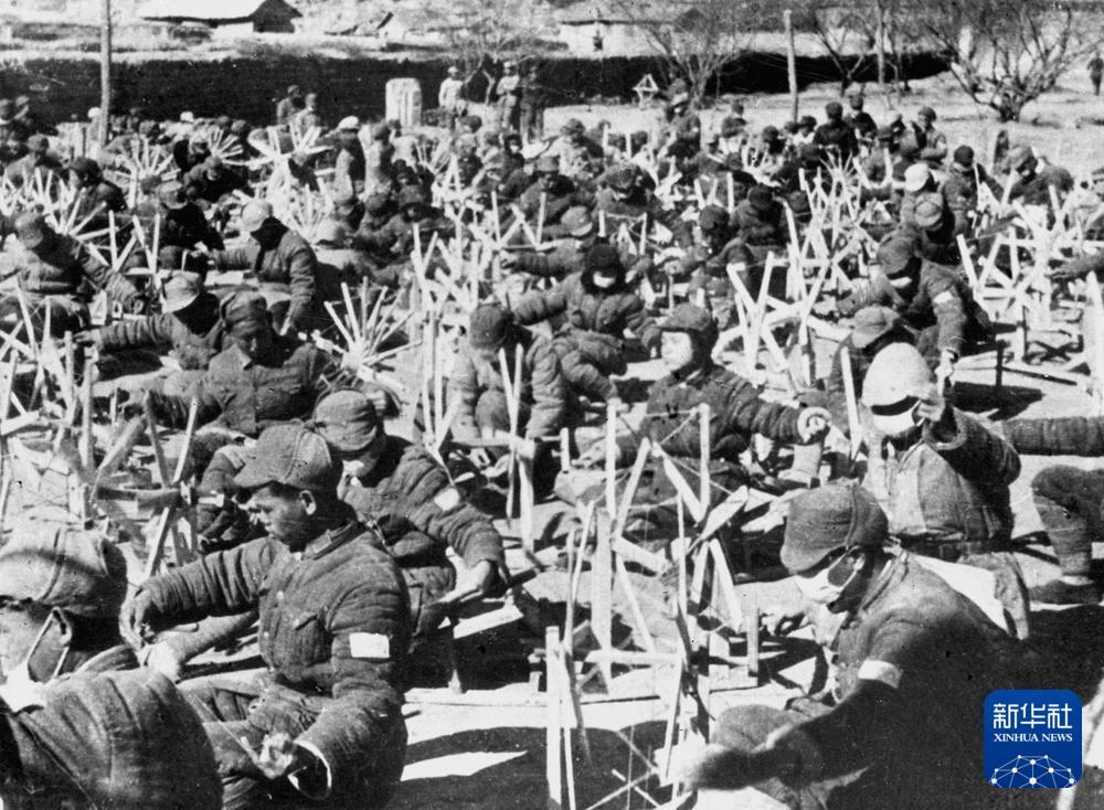 八路军战士坐在纺纱车前纺纱。新华社发