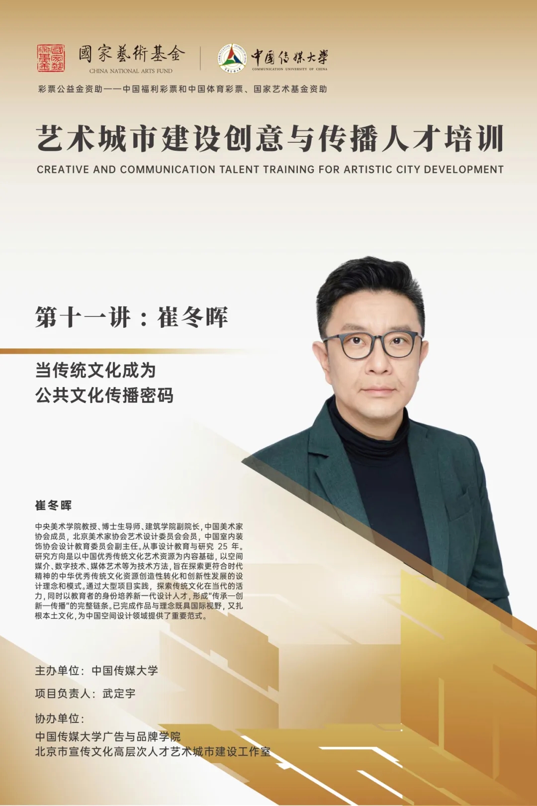 2025年7月7日,由中国传媒大学主办,中国传媒大学广告与品牌学院、北京市宣传文化高层次人才艺术城市建设工作室协办的2025国家艺术基金《艺术城市建设创意与传播人才培训》正式启动。本项目由中国传媒大学广告与品牌学院副院长武定宇教授担任负责人,面向全国公共艺术与城市文化领域的专业人才,旨在就新时代中国城市建设转型之际,培养新时代公共空间艺术创作和具有传播管理思维的艺术城市建设人才,尤其是支撑公共空间文化艺术品质提升及产业发展的复合型实用型人才,积极落实基层文化惠民政策,服务人民群众高品质生活需求,促进相关产业和城市发展繁荣。
