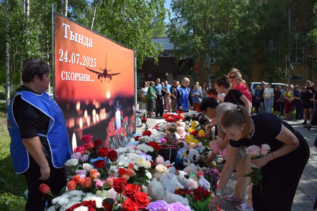 7月25日,人们在俄罗斯阿穆尔州滕达市悼念客机失事遇难者。新华社发(俄罗斯滕达市政府新闻处供图)