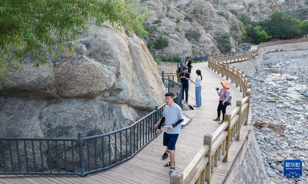 7月23日,游客在贺兰山岩画景区游览(无人机照片)。新华社记者 杨植森 摄