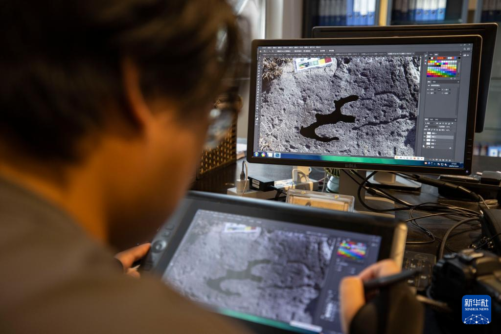7月23日,工作人员在绘制岩画电子线描图。在岩画普查工作中,岩画电子线描图是实景岩画图像数字化的一种辅助方式,使画面清晰明确地呈现在岩画信息资料库中,便于日后查阅与研究工作。新华社记者 杨植森 摄