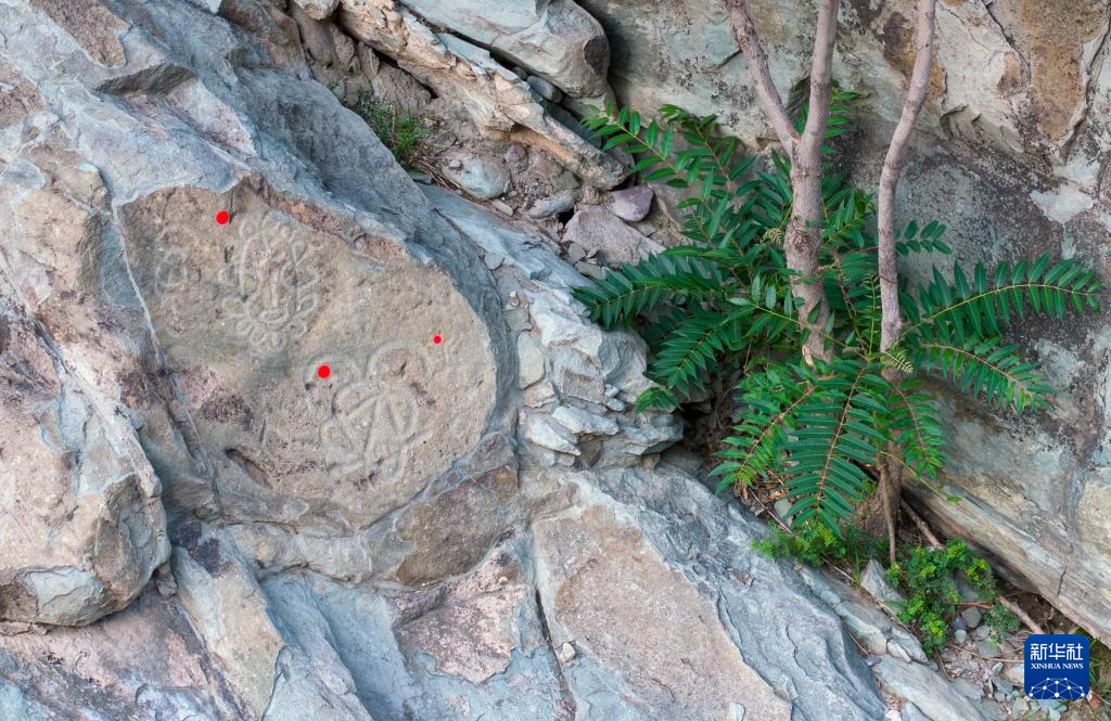 这是7月23日在贺兰山岩画景区拍摄的岩画和红色标识点(无人机照片)。标识点方便游客找到岩画,可以随时粘贴,对石质和文物不会产生影响。新华社记者 杨植森 摄