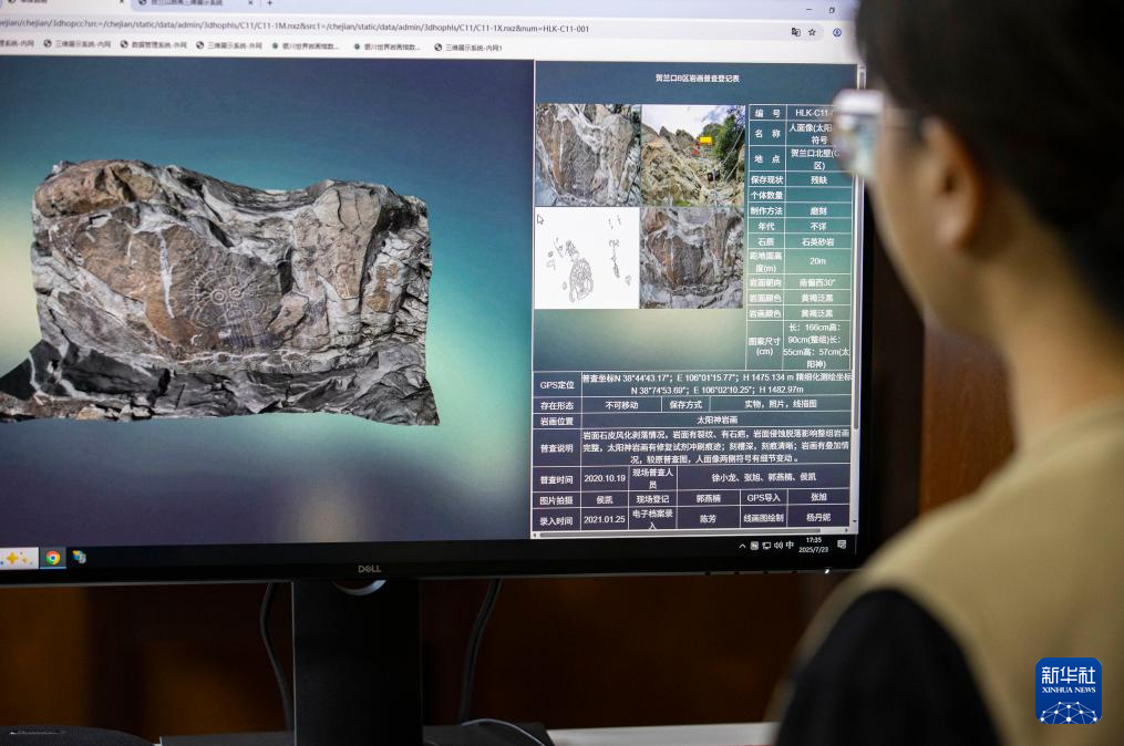 这是7月23日拍摄的贺兰山岩画多源数据管理平台。工作人员将贺兰口的形态和其中的岩画进行高精度扫描和建模,通过电脑便可查看贺兰口的整体情况和个体岩画样貌。新华社记者 杨植森 摄