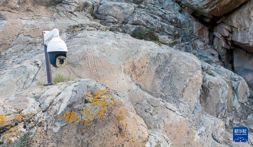这是7月23日拍摄的贺兰山岩画景区的监控摄像头(无人机照片)。目前,贺兰山岩画景区内有100多个监控摄像头,对岩画情况进行监控。新华社记者 杨植森 摄
