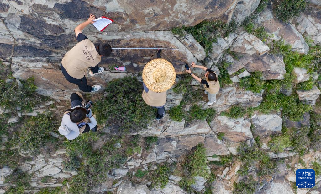 7月23日,工作人员在贺兰山岩画遗址区内进行2025年度岩画复查(无人机照片)。新华社记者 杨植森 摄