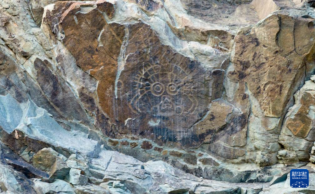 这是7月23日拍摄的贺兰山岩画景区内著名的标志性岩画“太阳神”(无人机照片)。新华社记者 杨植森 摄