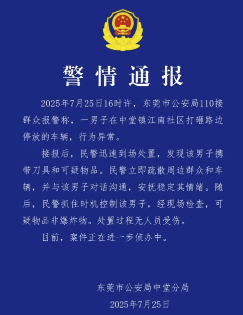 央视网消息:据东莞市公安局中堂分局,7月25日16时许,东莞市公安局110接群众报警称,一男子在中堂镇江南社区打砸路边停放的车辆,行为异常。