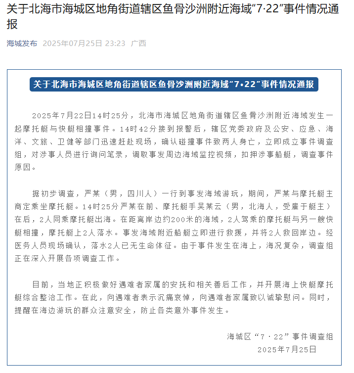 央视网消息:广西北海市海城区“7·22”事件调查组7月25日通报称,7月22日14时25分,北海市海城区地角街道辖区鱼骨沙洲附近海域发生一起摩托艇与快艇相撞事件。据初步调查,严某(男,四川人)一行到事发海域游玩,期间,严某与摩托艇主商定乘坐摩托艇。14时25分严某在前、摩托艇手吴某云(男,北海人,受雇于艇主)在后,2人同乘摩托艇出海。在距离岸边约200米的海域,2人驾乘的摩托艇与另一艘快艇相撞,摩托艇上2人落水。事发海域附近船艇立即进行救援,并将2人救回岸边。经医务人员现场确认,落水2人已无生命体征。