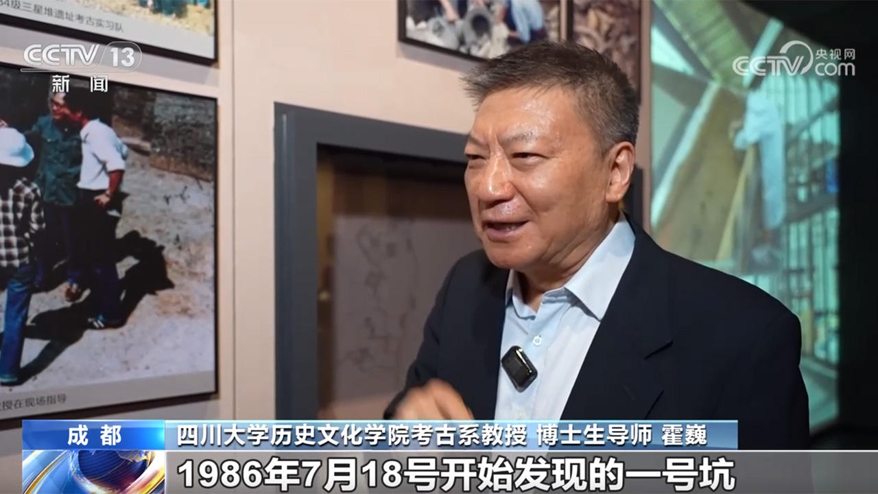 在三星堆遗址考古发掘的照片墙前,长期从事边疆考古与中国藏学研究的霍巍教授,向记者讲述了川大人和三星堆的不解之缘。这两张照片拍摄于1986年,从冬天的绿棉衣到夏天的白衬衫,年轻的霍教授意气风发,当时刚毕业留校的他,参加了川大考古队对三星堆的大规模发掘。工作接近尾声时,两个祭祀坑横空出世,揭开了三星堆悠久祭祀传统的面纱。