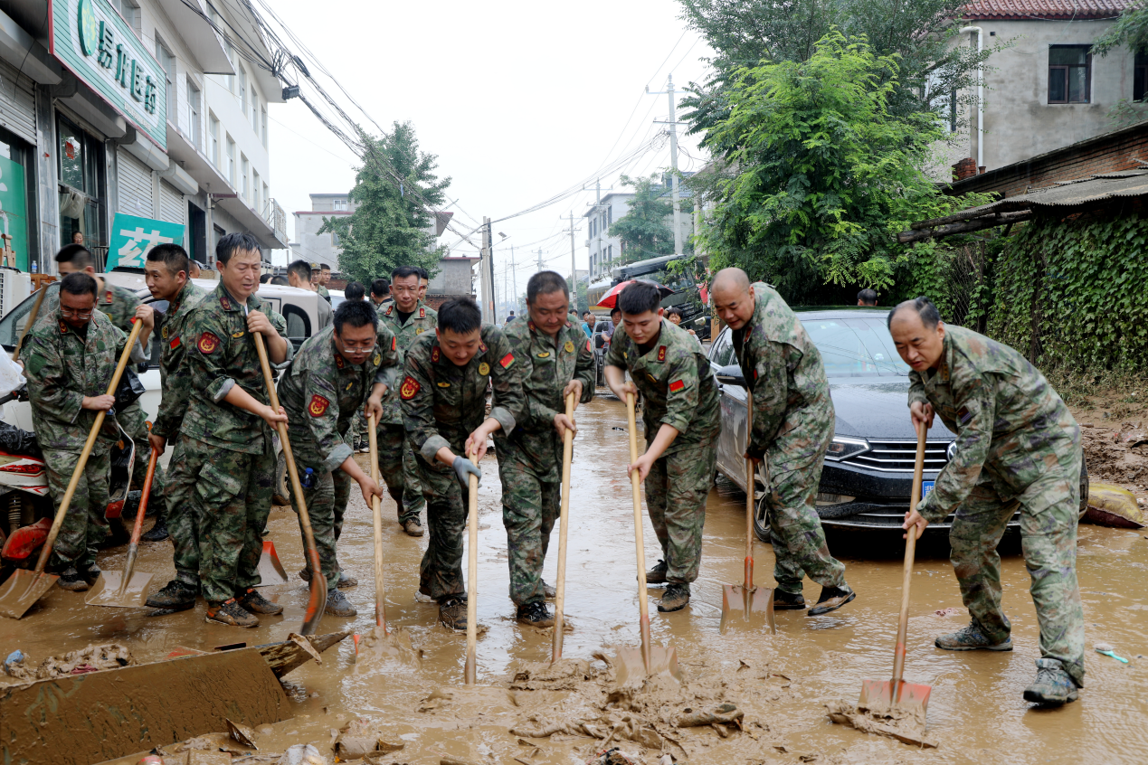 洪水退后,该村主干道上的淤泥最深处达50厘米,混杂着杂物和生活垃圾,散发着刺鼻气味。民兵们顶烈日、踏泥泞,分成多个作业组,用铁锹一锹一锹铲,再用推车将淤泥运走,全然不顾额头渗满汗珠,泥水沾满全身。易县民兵应急连民兵王尚武满头大汗。他说:“27日上午到达任务现场,对现场道路开始进行清理、清运,目前,已经清理村内主道路200米。”