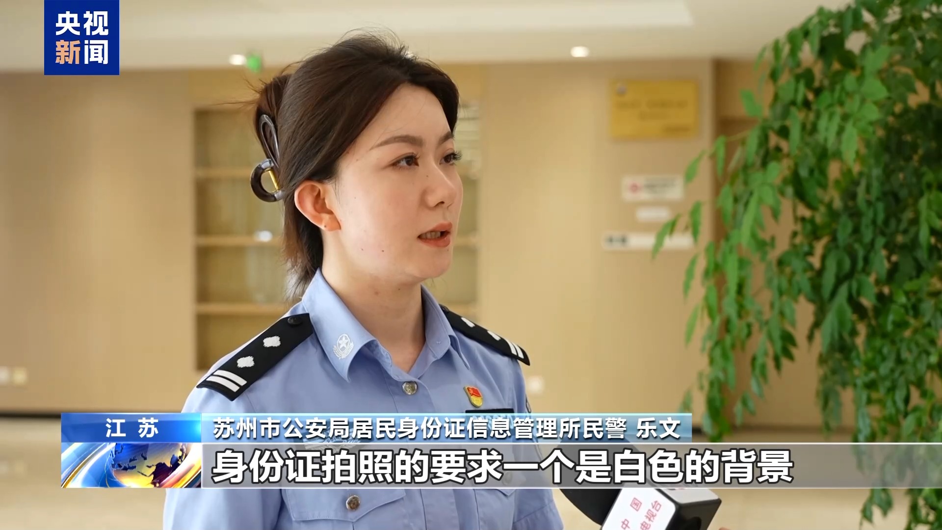 苏州市公安局居民身份证信息管理所民警 乐文:身份证拍照的要求一个是白色的背景,所以就要尽量穿深色有领的上衣,避免穿白色或者黄色等颜色比较浅的上衣,这是为了防止和背景混淆。另外一方面像化妆,有些女性她会化一点妆,身份证上的要求是不能化浓妆,包括发型不能过于蓬松高耸,不能遮盖眉毛、耳朵,还有不能染过于艳丽的彩发,包括一些比较大的首饰、耳环、项链,也是不能佩戴的。只要符合这几条,就是可以的。