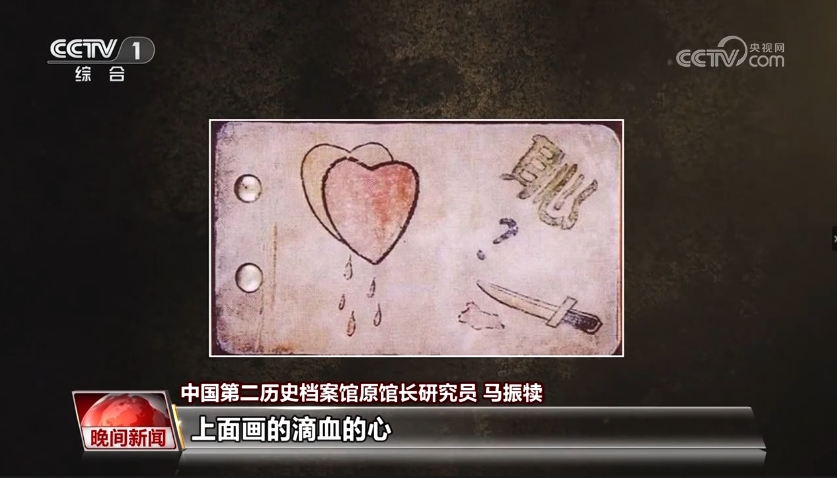 中国第二历史档案馆原馆长研究员 马振犊:这个日本军官,他们照这个照片完全是为了一种娱乐和一种发泄。他(罗瑾)精选了16张做了一个相册,而且自己为这个相册做了一个封面,上面画的滴血的心,还有一把刀插在心上面。那么他的意图是把这些日本人自拍的、屠杀中国人的照片作为一种历史证据把它留下来。