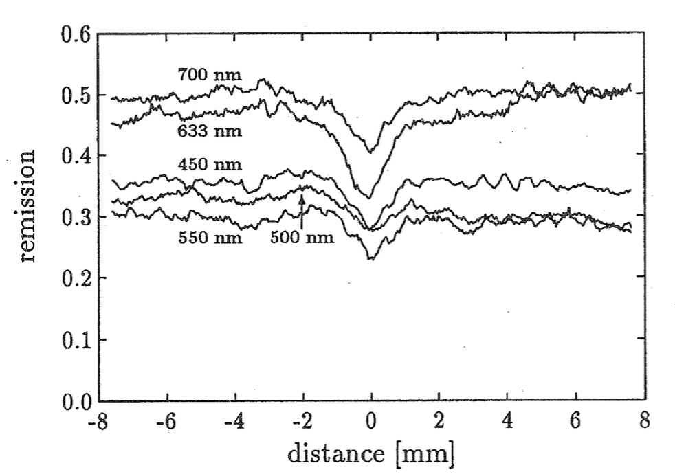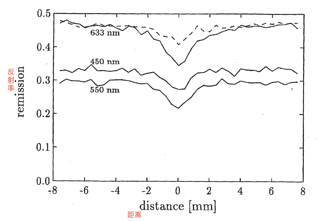 图一 模拟短波长(450 nm,蓝光)、中波长(550 nm,绿光)和长波长(633 nm,红光)穿过皮肤后从静脉区域反射的强度变化