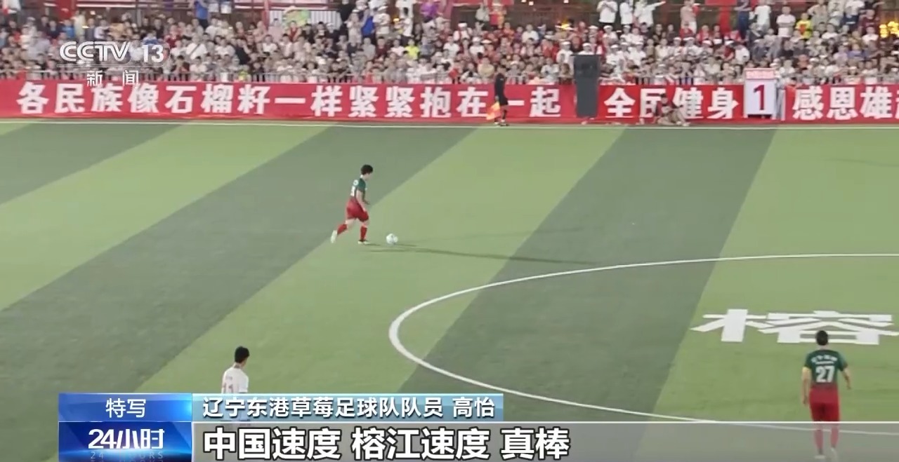 辽宁东港草莓足球队队员 高怡:我们2023年5月份来了一次,2024年8月份来一次,今年是第三次。看到他们洪水受灾,心情是很沉重的,因为我们跟他们很有感情。没想到榕江重建的速度这么快,中国速度、榕江速度,真棒。