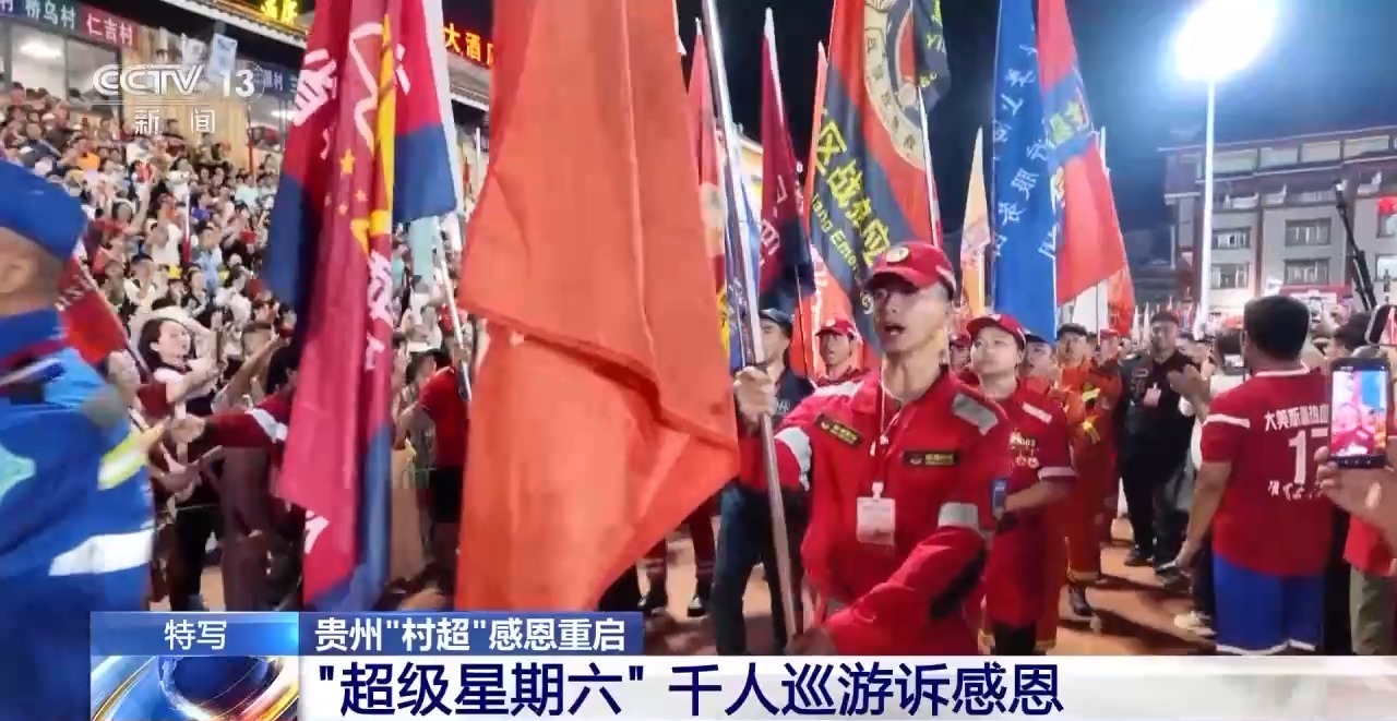 总台记者 郭亦馨:不止赛场上赛况激烈,球场外围的跑道上正在举行千人感恩大巡游。在半个月之前,救援队陆续撤出榕江县的时候,当地的百姓就和他们约好,当榕江“村超”重启之时,邀请他们再回榕江来看“村超”,今天他们如约而至。