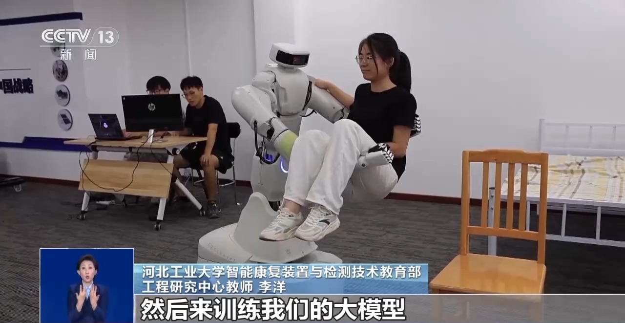 河北工业大学智能康复装置与检测技术教育部工程研究中心教师 李洋:安全性主要是从两方面来进行考虑,一是建立的人体以及人机耦合的动力学模型,在整个转运过程中,可以根据它的电子皮肤检测到的人机之间的交互力来调整人体的姿态,来确保安全性。其次,还有视觉传感器来时刻观测人体的姿态,结合刚才触觉传感器产生的调整,进一步调整它的姿态。这个机器人负载能力比较大,这是由于采用了差动式的关节,使得它可以叠加电机的转矩并结合视觉传感器对周围环境的检测,调整它的动作产生安全性,而且可以规避空间中障碍物。接下来准备将它应用在养老院,首先采用遥操作加底层智能的方式,同时也是采用这种方式进一步地收集数据,用来训练大模型,使它具备决策能力,从而最终实现全自主的对老年人护理。