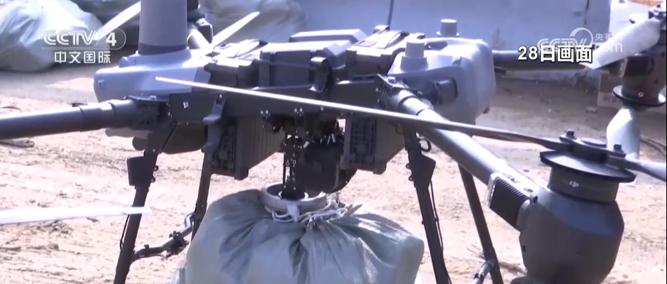 在琉璃庙镇安州坝一桥,可以看到很多架无人机,无人机下方挂载了救灾物资,这些物资当中包括有矿泉水、面包、火腿肠、鸡蛋,可以保障受灾群众的基本生活需求。相关人员介绍,救援无人机可以搭载30公斤的救援物资,达到20多分钟的续航时间,飞行速度为15米每秒,两分半钟就可以跨越两个山头,前往受灾的区域进行物资投送。同时,工作人员可以利用喊话器,指引灾民前往指定的区域领取救援物资,同时也可以通过视频载荷,观察受灾群众的身体状况、人数等这些情况。