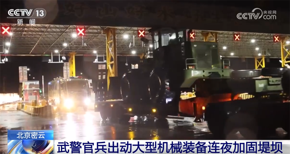 北京密云:武警官兵出动大型机械装备连夜加固堤坝