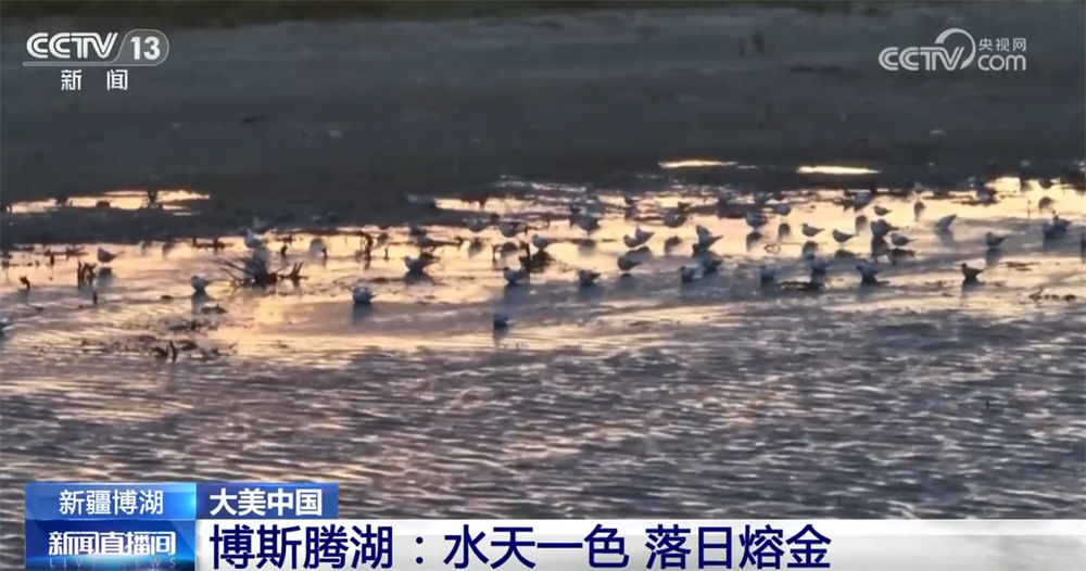 央视网消息:近日,新疆博斯腾湖畔出现了绚烂的霞光景观,落日余晖将天边的云雾、碧波荡漾的博斯腾湖渲染得一片橙黄;浮光跃金的博斯腾湖上,鸟儿悠闲游曳,与远处的沙漠、绚烂的晚霞共同勾勒出一幅壮美画卷。