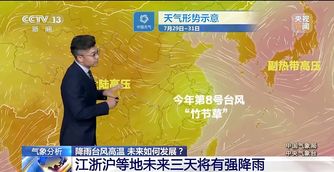 随后,强降雨将转移至华东地区。这主要受今年第8号台风“竹节草”影响。未来“竹节草”将逐渐向中国沿海靠近。“竹节草”在西北太平洋台风史上较为少见:它于23日生成后向东北方向移动,26日逐渐减弱停编,27日再次增强并获得命名。预计其可能在30日登陆中国华东地区。受其影响,江苏南部、上海、浙江东部等地降雨将有所增强,30日普遍有大到暴雨天气。