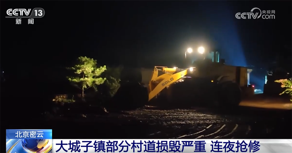 在密云区大城子镇柏崖村,部分村道被洪水冲毁。28日下午,水位下降之后,工程车辆进入,连夜进行抢修工作。
