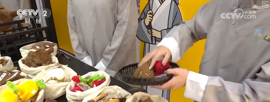 现场把脉、望闻问切,在这个毛绒玩具组成的“中药铺”里,枸杞、陈皮、折耳根等各类“中药材”不仅形象逼真,有的甚至还原了药材的气味。宣纸药方上盖好章之后,店员会按方抓出各类药材,放进“包治百病”的药罐里,再询问一句火候和口味,一阵“煎煮”之后出锅打包,环环相扣,体验感十足。