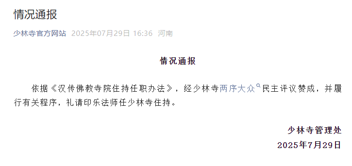 ·少林寺管理处:目前少林寺运行一切正常,相关问题正在进一步调查。印乐法师任少林寺住持。