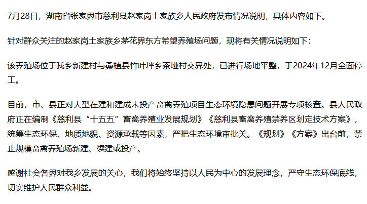 ·张家界慈利县通报“东方希望养殖场问题”:去年12月全面停工。