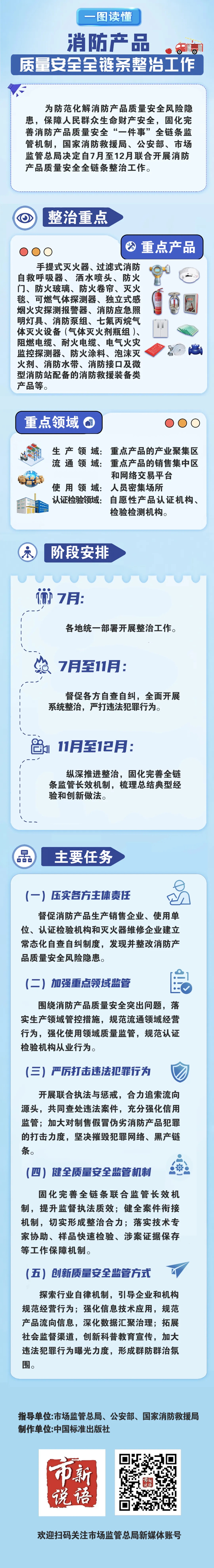 方案部署了压实各方质量安全主体责任、加强全领域重点监管、规范认证检验机构从业行为、加大违法犯罪行为打击力度、健全质量安全监管机制、创新质量安全监管方式六个方面16项主要任务,力求通过整治工作,严惩各类违法犯罪行为,营造全民关注消防产品质量安全的良好氛围,构建完善多部门通力协作的全链条监管长效机制,从源头上有效遏制假冒伪劣消防产品增量,全面提升消防产品质量安全水平,规范市场秩序,优化营商环境,维护社会公共安全。