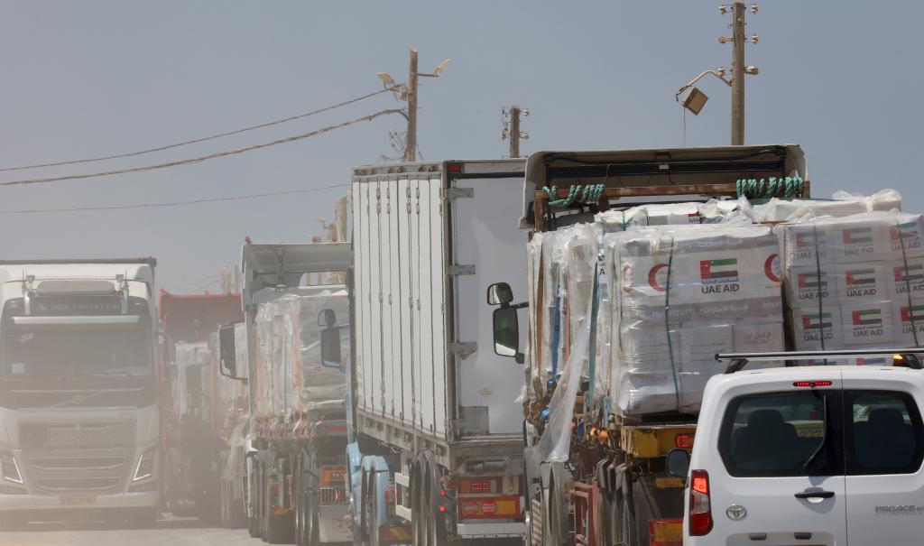 7月27日,在以色列与加沙地带边境以方一侧,载有人道主义物资的车辆排队进入加沙地带。新华社发(吉尔·科恩·马根摄)