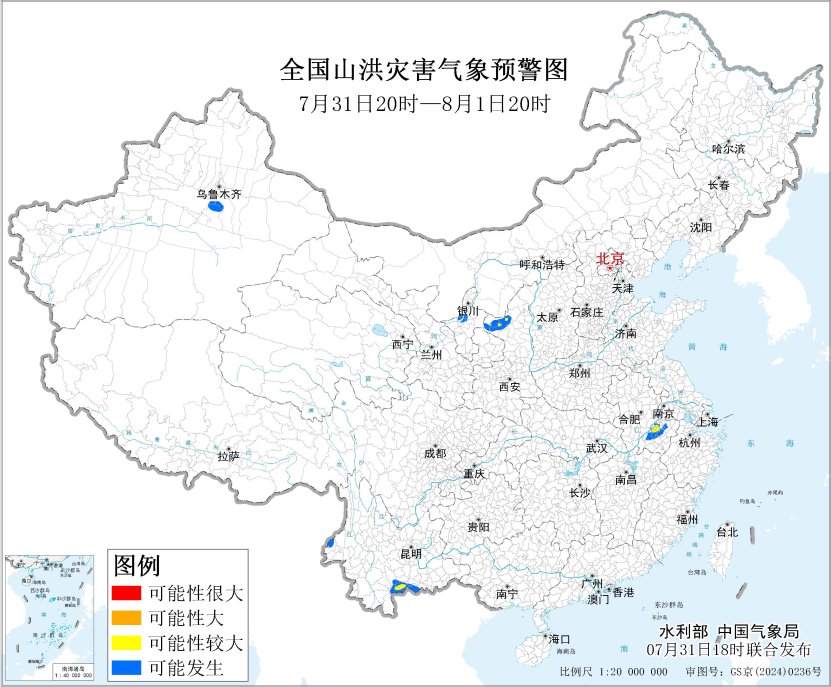 央视网消息:水利部和中国气象局7月31日18时联合发布黄色山洪灾害气象预警,预计,7月31日20时至8月1日20时,内蒙古西南部、安徽南部、云南西部和南部、陕西西北部、宁夏北部、新疆中部等地部分地区可能发生山洪灾害(蓝色预警),其中,安徽南部、云南南部、陕西西北部局地发生山洪灾害可能性较大(黄色预警)。其他地区也可能因局地短历时强降水引发山洪灾害,请各地注意做好实时监测、防汛预警和转移避险等防范工作。