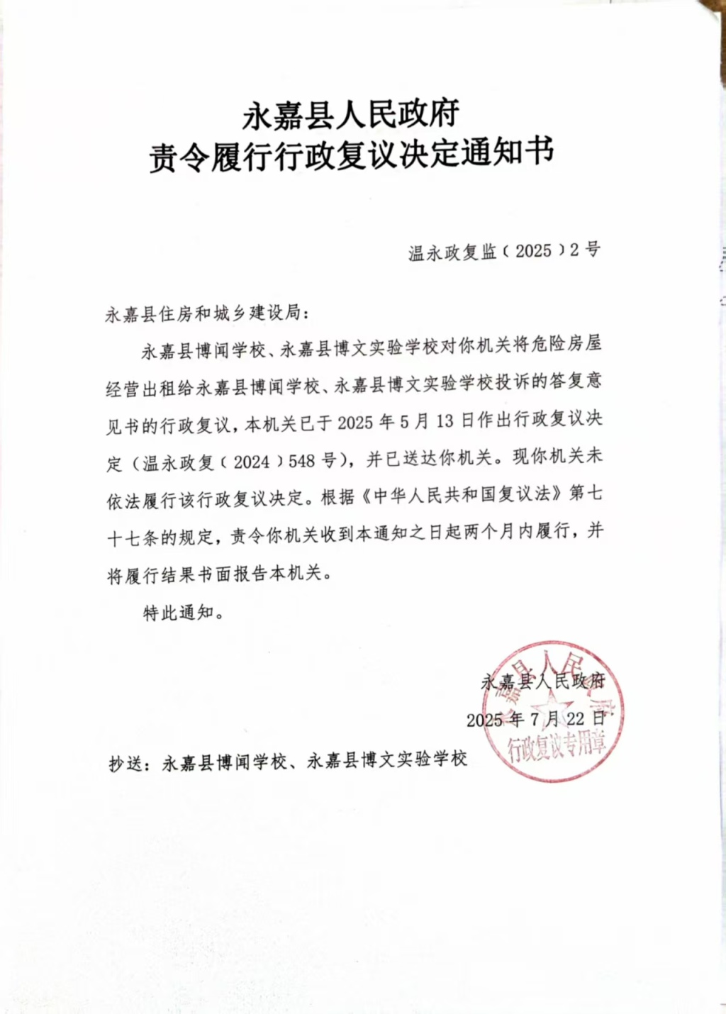 博闻学校认为永嘉县住建局作出的答复意见书事实认定不清,并未实际查处。2024年12月20日,该校提起行政复议,并获永嘉县政府受理。