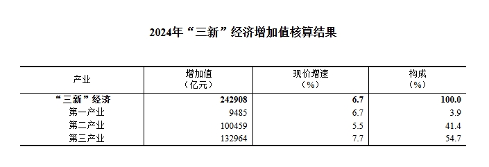 央视网消息:据国家统计局,经核算,2024年我国“三新”经济增加值为242908亿元,比上年增长6.7%(按现价计算),比同期国内生产总值(GDP)现价增速高2.5个百分点;占GDP的比重为18.01%,比上年提高0.43个百分点。