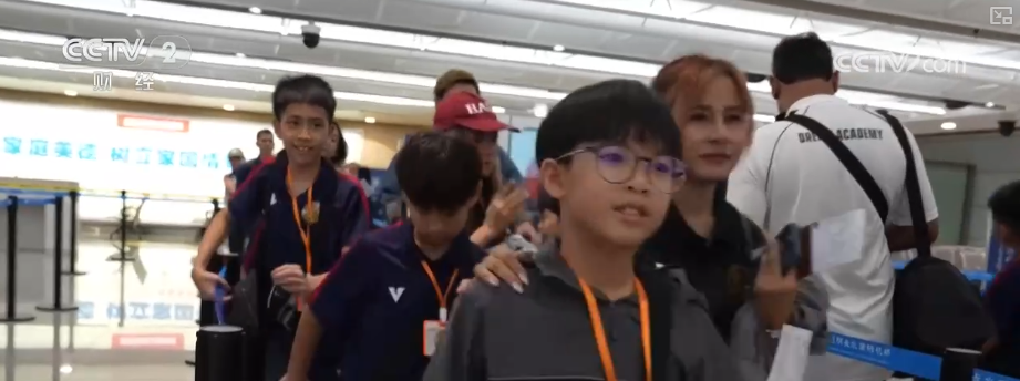 泰国籍领队珍吉特·塔察纳带领55名来自老挝、泰国等地的小朋友抵达昆明参加足球比赛。