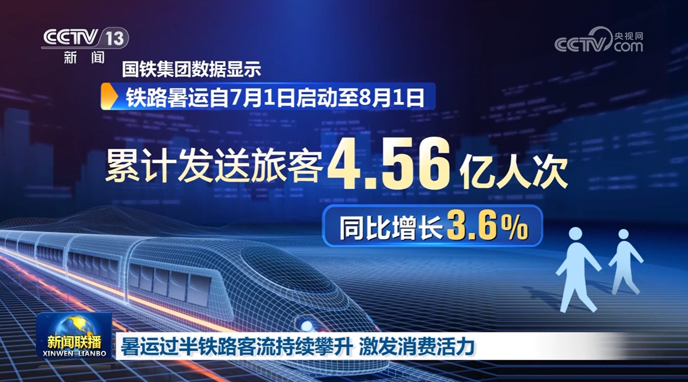 央视网消息(新闻联播):为期两个月的暑运时间过半,国铁集团最新数据显示,一个多月来,已有超4.5亿人次乘坐火车出行。新线增开列车,复兴号提速运行,持续激发暑期消费活力。