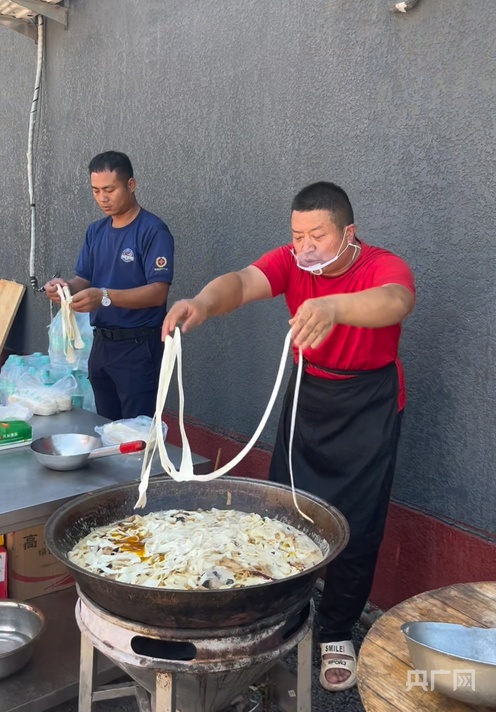 央广网北京8月2日消息(记者 庞婷)雨停后,北京怀柔区琉璃庙镇的清晨,阳光直射大地。临时搭起的灶台边,泥水早已被晒得收了浆,露出斑驳的泥土和坑洼的沙地。赵占胜的红色衬衫早被蒸汽熏得透湿,他将提前准备好的面一抻,两指往中间一卡,面剂子就成了宽宽的条,再手腕一抖,面条“嗖”地飞进滚着浓汤的大铁锅。