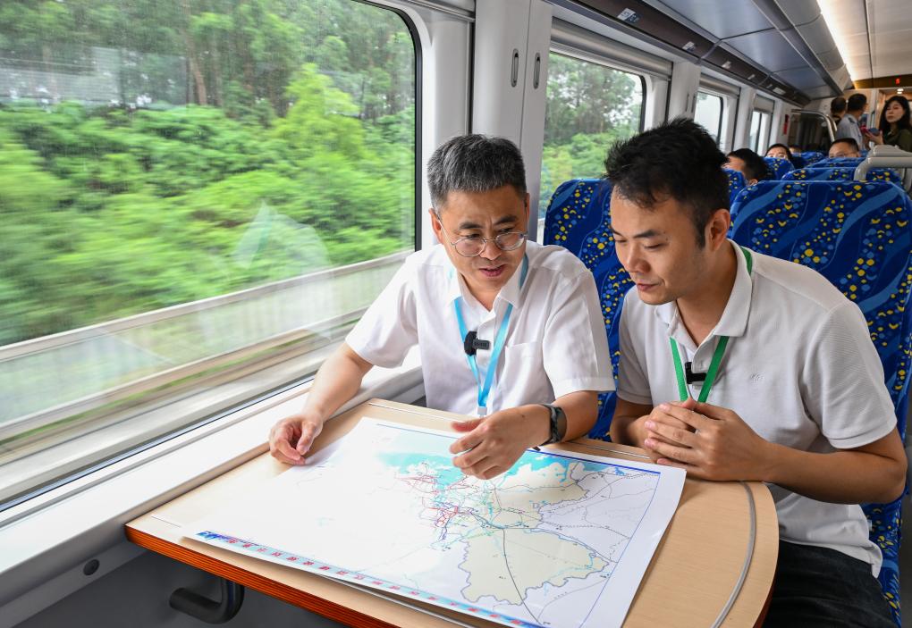 2024年5月26日,中铁第一勘察设计院集团有限公司广佛南环总设计师韩振江(左)介绍刚刚投入运营的广佛南环、佛莞城际铁路的设计思路。新华社记者 刘大伟 摄