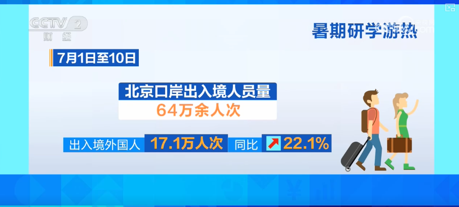 2025年暑期,海外学生和亲子家庭的研学入境游人数明显增加。7月1日至10日,北京口岸出入境人员量达64万余人次,其中,出入境外国人达17.1万人次,同比增长22.1%。