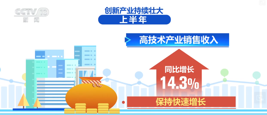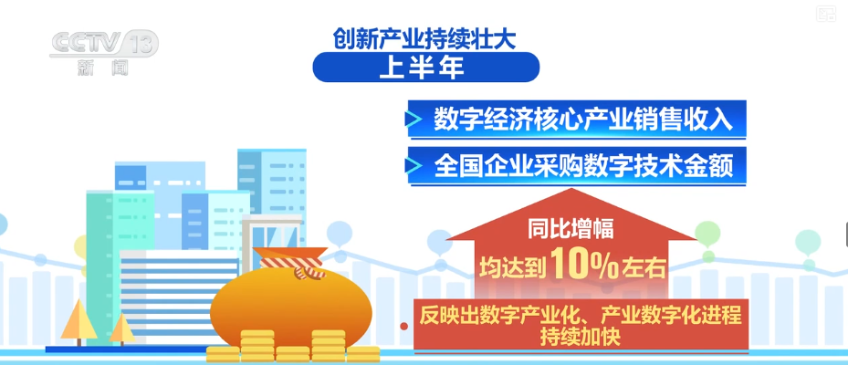 同时,创新产业持续壮大。上半年,高技术产业销售收入同比增长14.3%,保持快速增长。数字经济核心产业销售收入、全国企业采购数字技术金额同比增幅均达到10%左右,反映出数字产业化、产业数字化进程持续加快。