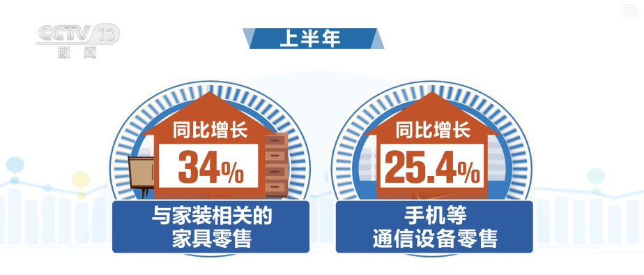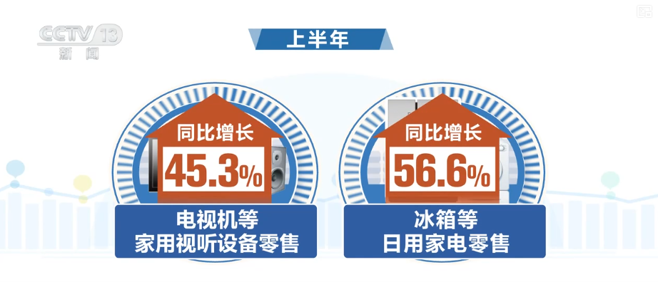 消费品以旧换新政策带动消费需求持续释放。上半年,电视机等家用视听设备零售、冰箱等日用家电零售同比分别增长45.3%和56.6%,与家装相关的家具零售同比增长34%,手机等通信设备零售同比增长25.4%。