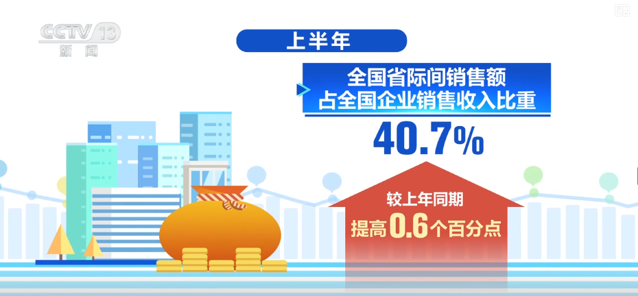 此外,上半年,全国省际间销售额占全国企业销售收入比重为40.7%,较上年同期提高0.6个百分点,反映省际间贸易联系持续加深,全国统一大市场建设稳步推进。