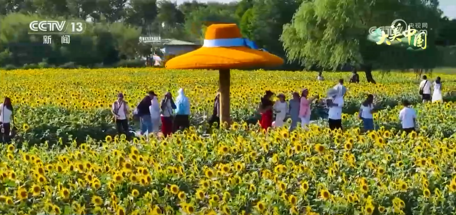 游客漫步向日葵花海中,寻找最佳位置拍照打卡,记录下美好的瞬间;每一株向日葵挺直了腰杆,与蓝天白云、湖光山色相互映衬,构成了一幅美不胜收的田园画卷。
