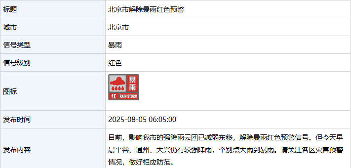 据北京气象局消息,目前,影响北京市的强降雨云团已减弱东移,解除暴雨红色预警信号。但5日早晨平谷、通州、大兴仍有较强降雨,个别点大雨到暴雨。请关注各区灾害预警情况,做好相应防范。