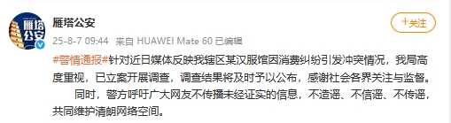 央视网消息:西安雁塔公安8月7日就网传“游客在西安汉服馆因消费纠纷遭商家殴打”发布警情通报:针对近日媒体反映该辖区某汉服馆因消费纠纷引发冲突情况,西安雁塔公安局高度重视,已立案开展调查,调查结果将及时予以公布,感谢社会各界关注与监督。同时,警方呼吁广大网友不传播未经证实的信息,不造谣、不信谣、不传谣,共同维护清朗网络空间。