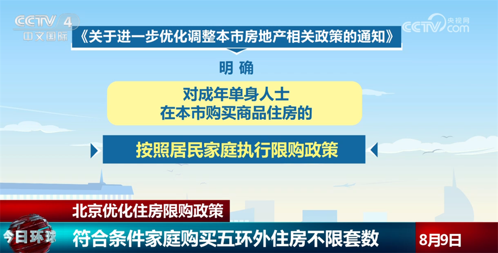 此次《通知》明确,京籍居民家庭、在本市连续缴纳社会保险或个人所得税满2年及以上的非京籍居民家庭,购买五环外商品住房不限套数。对成年单身人士在本市购买商品住房的,按照居民家庭执行限购政策。