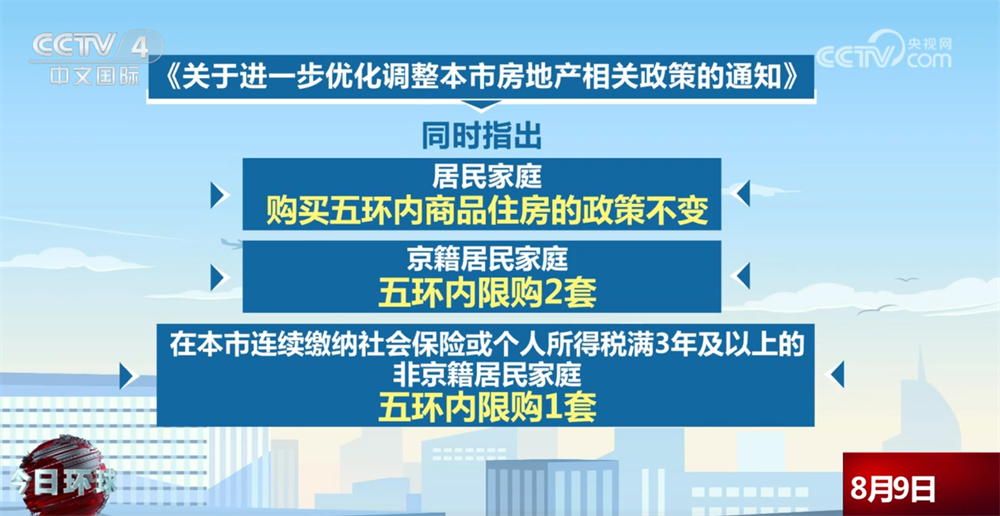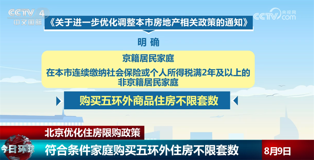 央视网消息:8月8日,北京市住房和城乡建设委员会、北京住房公积金管理中心联合印发《关于进一步优化调整本市房地产相关政策的通知》,自2025年8月9日起,符合本市商品住房购买条件的居民家庭,购买五环外商品住房(含新建商品住房和二手住房)不限套数。《通知》还加大了对住房公积金贷款支持力度。