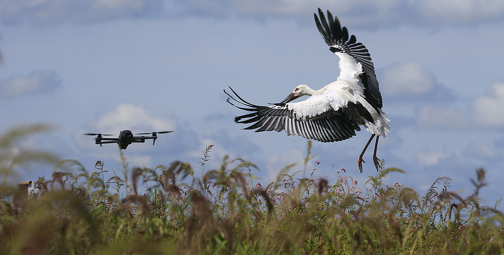 2025年8月8日,黑龙江省哈尔滨市,哈尔滨市林业和草原局在金河湾湿地公园举行“重返自然·和谐共生”野生鸟类放归活动,两只国家一级保护动物东方白鹳被放飞,它们展翅翱翔在蓝天白云间。