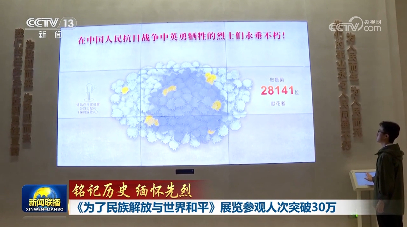 央视网消息(新闻联播):《为了民族解放与世界和平——纪念中国人民抗日战争暨世界反法西斯战争胜利80周年》主题展览向公众开放一个多月来,参观人数已突破30万人次。展厅内,包括左权将军的家书、李天佑在伏龙芝军事学院的笔记等一百余件(套)一级文物展出,吸引各界人士驻足参观。展览特别设立的“弘扬伟大抗战精神 深切缅怀抗战英烈”专区,两侧白墙上镌刻着著名抗日英烈和英雄群体名录,观众将手轻放于互动装置屏幕上,通过鞠躬、敬礼完成献花仪式,表达缅怀之情。在抗战家书视听空间,AI技术将10封家书制作成微缩版“纪录片”,引领观众走进抗战英烈的精神世界。