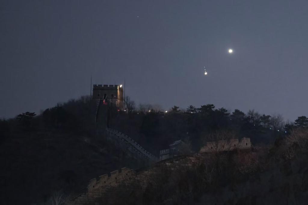 2023年3月2日,在北京怀柔区水长城拍摄的金(右上)木(左下)极近。(周博 摄)